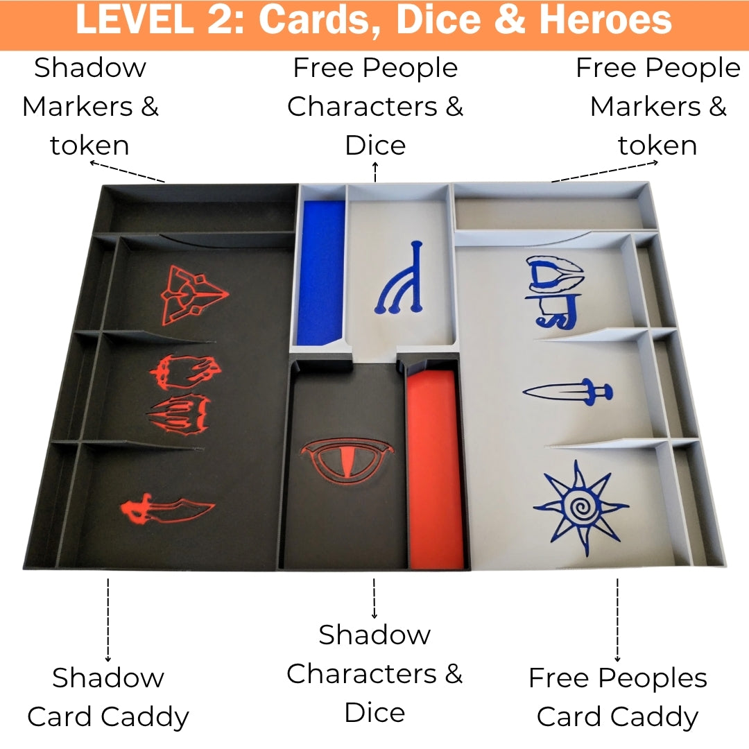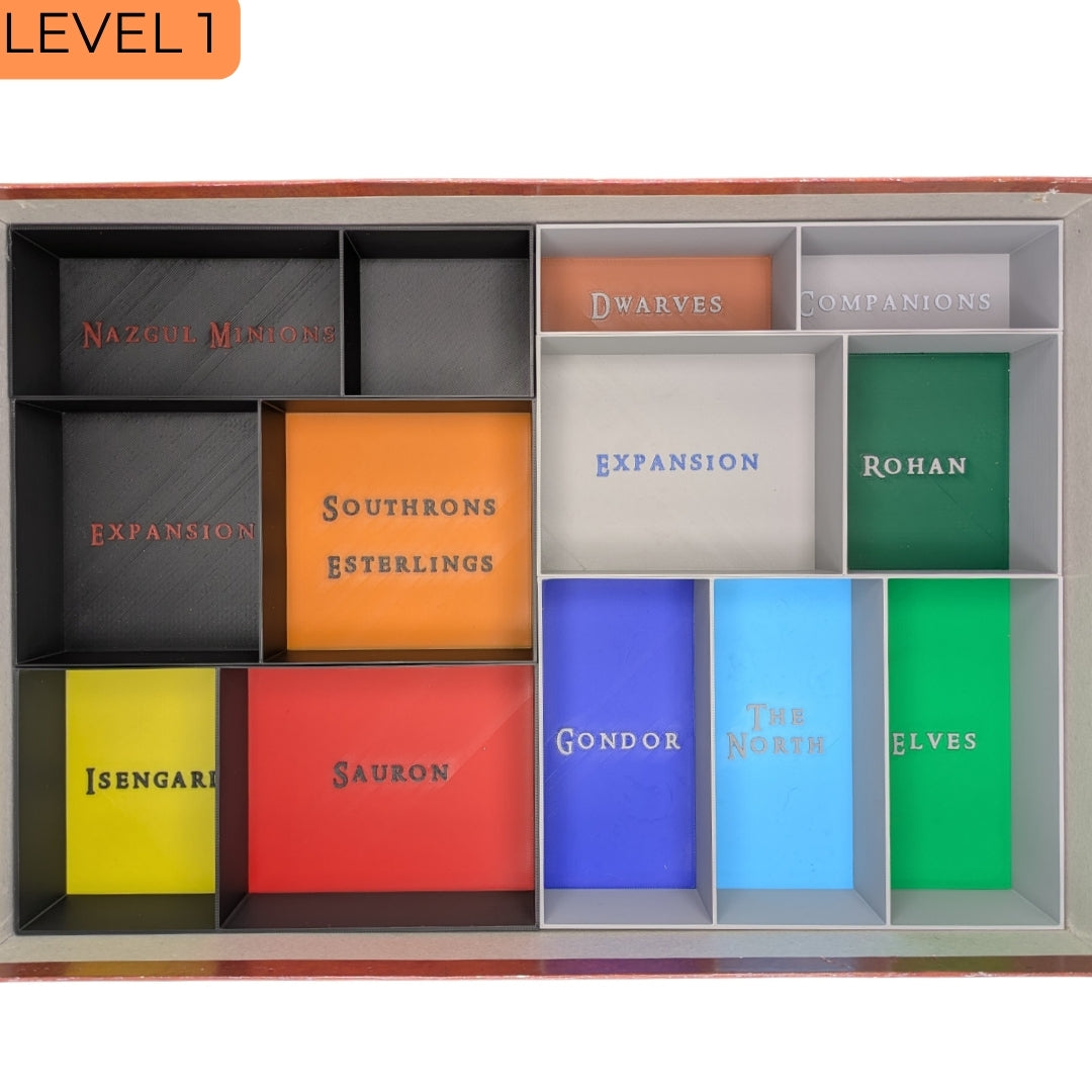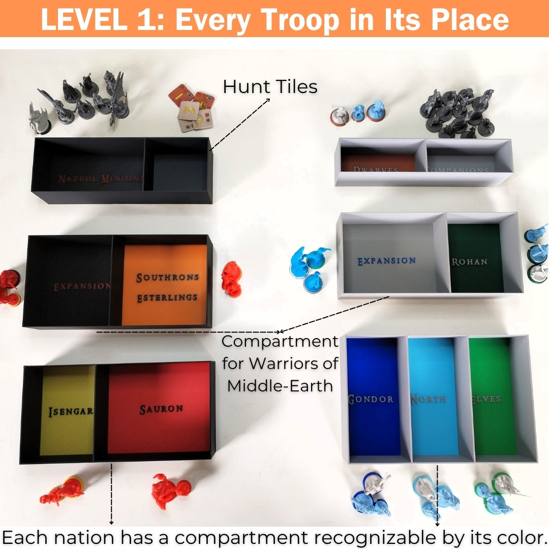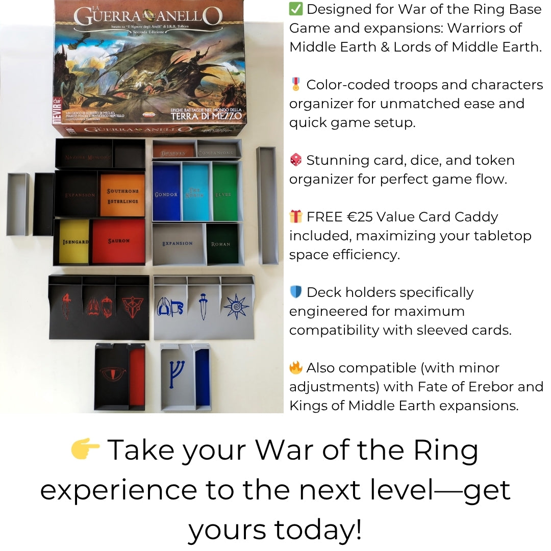 Tired of long setup times and messy cleanups? This full organizer system for War of the Ring – Second Edition transforms your game sessions with intuitive storage and a sleek, faction-colored layout. From the base game to the included card holder, everything has its place.